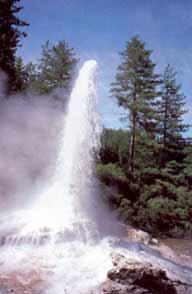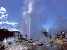 Atomkraftwerke sucht man vergebens. Riesige Thermalkraftwerke schöpfen ihre Kraft aus dem Boden. Die durchnittliche Wasser-bzw. Dampftemperatur beträgt ca. 76 Grad Celsius. Diese sinnvoll genutzte und beinahe unerschöpfliche Energie ist gleichsam Lebenselixier für die ganze Region. Die heissen Quellen von Waiotapu mit dem mineralhaltigen Wasser enthält auch Spurenelemente von Gold, Silber, Schwefel und Arsen. Die eigenwillige Geschmacksrichtung dieses Wassers bleibt wohl allen Reisegästen in bester Erinnerung. Der Lady Knox Geyser, ein weiters Wunderwerk der Natur, wurde 1896 zufällig von Strafgefangenen beim Waschen enteckt. Ein sehr beeindruckendes Schauspiel bilden die riesigen Wassermassen, die bei den Huka Fällen in die Tiefe stürzen. Leider war der Himmel verhangen und ein leichter Regen verdeckte uns die Sicht über den Lake Taupo und zum Ruapehu. |